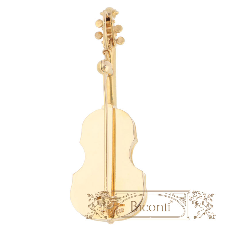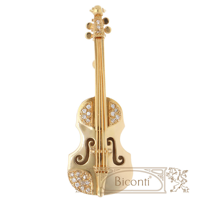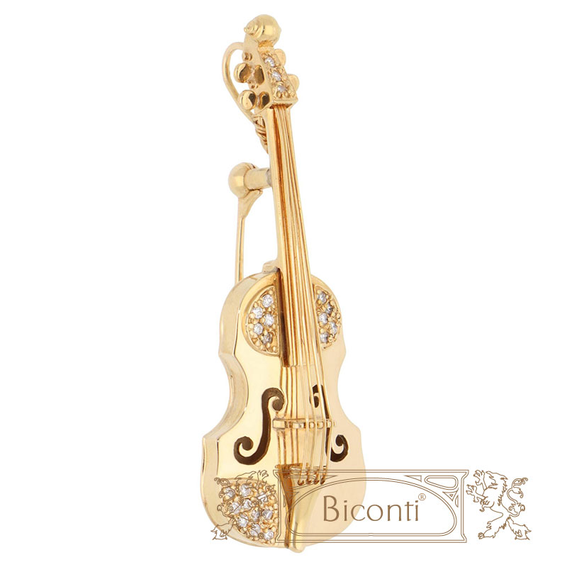 Бриллиантовая брошь-скрипка с великолепной отделкой, оправленная в желтое золото 18 карат. На броши изображена скрипка с множеством тонких струн искусной работы.